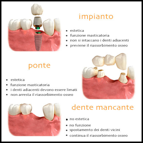 La classica domanda di molte persone che devono procedere alla sostituzione protesica di un dente e’ se convenga optare per il tradizionale ponte ad appoggio sugli elementi dentari adiacenti o inserire un impianto in titanio. Il dr Spadaro saprà fornirvi la soluzione migliore per il vostro caso.