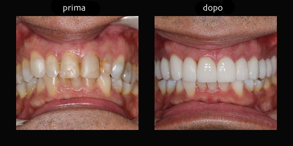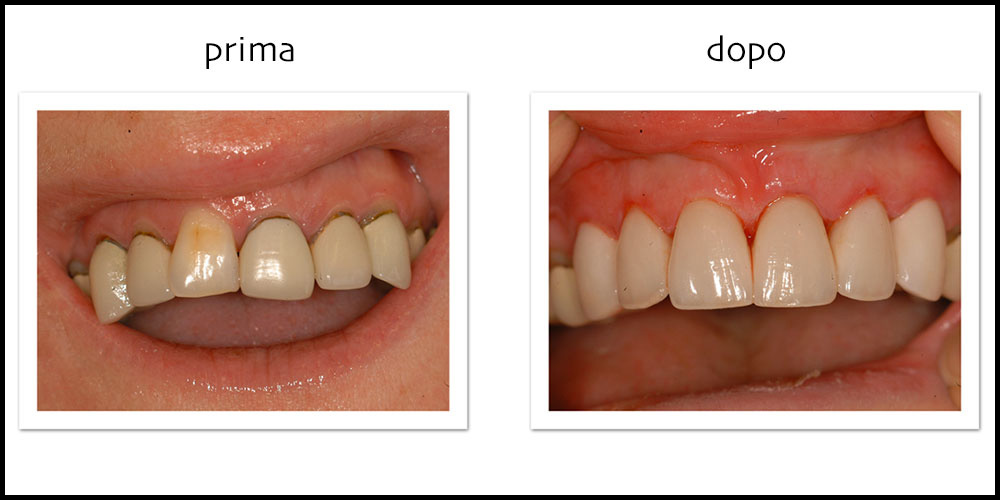 Come si vede, le classiche corone in metallo ceramica, pur validissime ancora oggi per la loro robustezza nei settori posteriori, lasciano in seguito alla retrazione gengivale, fisiologica con il passare del tempo, degli antiestetici bordi scuri. Per fortuna oggi e’ possibile sostituirle con i nuovi materiali senza metallo di ultima generazione e la cui struttura e interamente realizzata al computer mediante la tecnologia CAD-CAM.